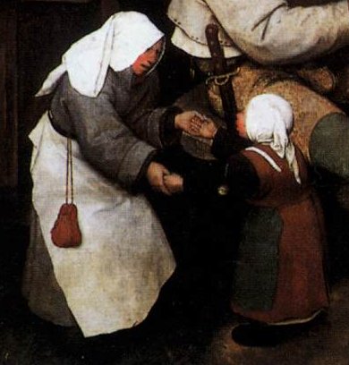 Bruegel in this painting has once again put a moral slant on what he depicts. This is not just a humorous picture recording village life. Gluttony, lust and anger can all be seen in this painting. Look at the man seated next to the bagpipe player. He looks drunkenly at the bagpipe player trying to offer him a jug of ale. See how he has a peacock feather in his hair. This is symbolic of vanity and pride. Bruegel also draws our attention to the fact that although this is a “saint’s day” he has depicted the dancers having turned their backs on the church and take little notice of the picture of the Virgin which hangs from the tree.