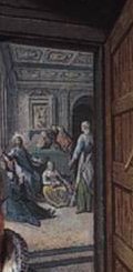 Finally if you look through the door on the left-hand side, you can see another kitchen scene. This is the Biblical story which Beuckelaer has introduced into each of his four paintings. This scene is set in the kitchen of the house of Mary and her sister Martha in which we see Jesus who has come to visit them. The story according to the Bible is that Martha complains to Jesus that although she is working hard in the kitchen, all Mary does is stand around listening to his words. Jesus reproached her saying that Mary’s contemplation was in fact a more important form of her work.