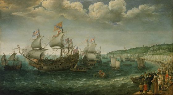Princess Elizabeth married Frederick in London on February 14th 1613 and after prolonged celebrations sailed from Margate on 25 April 1613 for Heidelburg and Prague, via the port of Flushing (in Dutch: Vlissingen). The couple were seen off by James I and Anne of Denmark both of whom can be seen in the foreground of the painting; they then were rowed out by bargemen in livery and brought aboard the sailing vessel, Prince Royal, which we can see lying at anchor awaiting the arrival of its distinguished guests. The vessel, Prince Royal was built in 1610 by Phineas Pett for Henry Prince of Wales, the king’s eldest son. This in all probability explains its “HP” monograms, Henry’s initials, (Henricus Princeps) and the Prince of Wales feathers as well as a figurehead of St George on a horse. Prince Henry did not attend his sister’s wedding to Friedrich as he died of typhoid fever, aged 18, a year before the event. The painting depicts a scene of pomp and ceremony as King James I sees off his daughter Princess Elizabeth and her husband. The beach scene with its mass of figures is typical of Willaert’s works. The ship lies in the centre of the picture surrounded by a blaze of natural, but highly suggestive white light.