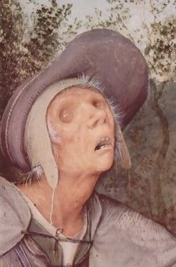 Look at the fear in the face of the second man as starts to fall. As we look at the figures we know that their forward motion is unstoppable and we are all fully aware of what is likely to happen next. The fallen leading man and the stumbling of the next two disrupt the calm and tranquil Brabant landscape.