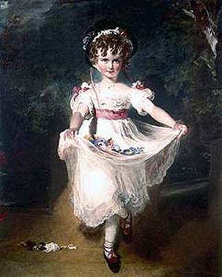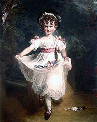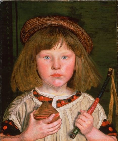 The portrait which hung next to the Irish Girl was entitled The English Boy and was the companion piece to the Irish Girl. In this case the young child depicted was no stranger to Brown. It was his five year old son, Oliver, and this too was painted in 1860. It is slightly larger than the Irish Girl, measuring 39cms x 33cms. This portrait is owned by the Manchester Art Gallery, which acquired it in 1932. Although a companion piece to the Irish Girl they couldn’t be more different. In this portrait, the young child stares straight at us with a self-assured gaze. It is a deadpan expression and we wonder what is going through his mind. His cheeks are slightly flushed and this colouring in some way matches the red shawl and lips of the Irish Girl. He wears a white smock over a red checked dress and on top of his head, sitting at a slightly jaunty angle, is a brown straw hat. In his hands he clutches on tightly to the popular child’s toys of the time, a top and whip. The way in which he holds the toys in some way reminds us of royal paintings where the subject holds a sceptre and orb.