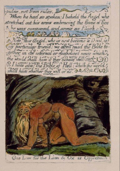 The original depiction of Nebuchadnezzar by Blake dates back to plate number 24 of his book The Marriage of Heaven and Hell which he created between 1790 and 1793 and which was a series of texts and illustrations which expressed Blake’s own intensely personal romantic and revolutionary beliefs. The book was published as printed sheets from etched plates and contained a mixture of prose, poetry, and illustrations.
