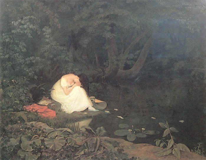 My Daily Art Display painting for today is by Francis Danby which he completed in 1821 and is entitled Disappointed Love. The painting was the first painting Francis Danby exhibited at the Royal Academy, and it became one of his best-known works. Before us, we see a heartbroken young woman who has just been jilted. Her hands cover her face as she sits weeping on the bank of a lily pond surrounded by dark and murky woodland. The occasional small white flowers, dotted around, struggle to lift the dark green and browns of the undergrowth. This gloomy undergrowth mirrors the depressed mind of the young girl. Her long dark tresses hang down over her white dress. On the ground beside her we see her discarded bonnet, her scarlet shawl , a miniature portrait of her lover and other letters which she has not yet destroyed. Her sad figure dressed in white is reflected in the water and in some way it seems that the water is drawing her to it so that she can end her life and her misery, in an Ophelia-like fashion. Floating on the surface of the pond are pieces of a letter which she has torn up and discarded. Eric Adams wrote a biography in 1973 on Francis Danby entitled Francis Danby: varieties of poetic landscape and he believes the setting for the painting was on the banks of the River Frome on the outskirts of Bristol and that the model for the painting was a model at the Bristol Artists newly founded Life Academy. There was a lot of criticism of the painting, not so much for the poetical nature of the work but for its technical faults, in particular the lack of proportion of the plants in the foreground.