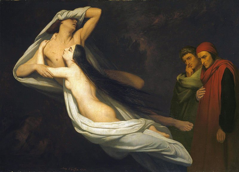My featured painting today is about two lovers from Dante’s Divine Comedy who Dante and Virgil meet, trapped in the stormy darkness of the Second Circle of Hell (Lust). It is here that those overcome by lust during their time on earth have been sentenced to remain. Dante condemns them, and those like them, calling them “carnal malefactors” for letting their sexual appetites affect their reasoning. These hapless souls are blown to and fro by the terrible winds of a violent storm, without hope of rest and this symbolizes the power of lust to blow one about needlessly and aimlessly. It is here that Francesca da Rimini tells Dante the story of how she and her lover Paolo ended up in this Second Circle of Hell.