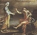 In the morning following the wedding she became aware of the deception. She was furious that she had been deceived and to make matters worse she realised that she had fallen in love with Paolo. Giovanni left Rimini on business leaving Paolo and Francesca together and they both realised that they loved each other. Their lovemaking was witnessed by Giovanni’s servant who sent word to his master, who then secretly returned home. He went to Francesca’s room in which were the two lovers. He banged on the door and shouted her name. They recognised Giovanni’s voice. Paolo pointed to a trapdoor in the floor that led to a room below. He told Francesca to go open the door as he planned his escape. However as he jumped through the open trapdoor part of his jacket got caught on a piece of iron. Francesca, unaware of his Paolo’s predicament, opened the door for Giovanni, believing she would be able to make excuses, now that Paolo was gone. When Giovanni entered the bedchamber he noticed Paolo caught by his jacket on the trap door. He immediately ran towards the trapdoor and with his rapier drawn thrust it at Paolo intending to kill him. Seeing what Giovanni intended to do, Francesca quickly ran between the two brothers to try to prevent it. But Giovanni’s rapier was already thrusting downwards towards the hapless Paolo but before it struck him the blade passed through Francesca’s bosom. Giovanni was totally distraught by what he had done for he still loved Francesca. He withdrew the blade of the sword from her body and immediately plunged it into his brother, killing him. The next morning, amidst much weeping, the two lovers were buried in the same tomb.