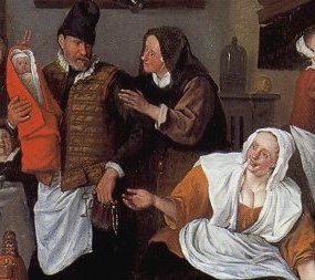 And so let us go back to the featured painting. Have you worked out the “sub-plot” depicted in this painting yet? Steen is best known for his humorous genre scenes, warm hearted and animated works in which he treats life as a vast comedy of manners and this work of his is no different. We are looking at a lying-in room. Whenever the lady of the house was about to give birth, one of the rooms was set aside for this purpose. The lying-in room was used for the actual delivery, and later to receive visitors. The birth of a child was, as it is now, a cause for celebration. It is greeted with both happiness and pride and in the 17th century in the case of the birth of a son, it became even more of a celebration for economic reasons as a son would often carry on his father’s business and would inherit the family possessions.
