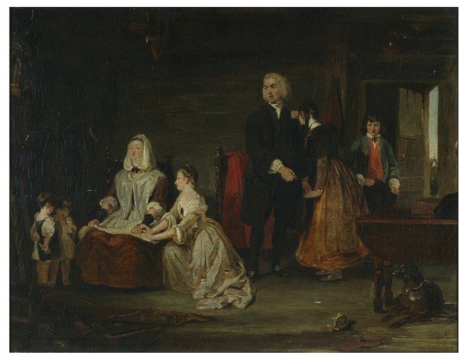 This novel, The Vicar of Wakefield, by Goldsmith was his most famous work of literature and in the painting we see Olivia, the vicar’s daughter, who had run away from home to be with the man she loved. Her father, the vicar, eventually finds her and brings her home and we see him, in the right of the painting, comforting his distraught but repentant daughter, who has buried her face against his shoulder. To the left of the painting we see the vicar’s wife who has her back almost turned away from her husband and daughter and by her facial expression we must believe she hasn’t quite come to terms with what has happened. She is now trying to balance the desire to punish her daughter for her misdeeds and yet show her some maternal love now that she is back in the fold. Her hands are clenched tight in her lap and we can see by her facial expression that she is not in a forgiving mood. Also included in the painting are the vicar’s two youngest sons who stand in front of their mother completely unaware of what is happening. The younger daughter Sophia, who kneels at the side of her mother and who holds her mother’s hand in a comforting gesture, is pleading with her to forgive her errant sister, Olivia. The vicar’s second son Moses, stands at the far right of the painting, by the open door of the house and looks somewhat bemused and unable to know what to do for the best. The family dog lies under the table looking up aware of the commotion.