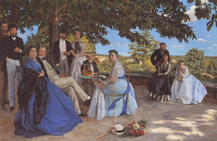 My featured painting today is probably Frederic Bazille’s most famous work, entitled Réunion de famille also called Portraits de famille (Family Reunion also called Family Portraits) which he completed in 1867 and altered slightly two years later. It is a large painting, measuring 152cms x 230cms. The subject of the work is an extended family gathering at Bazille’s family’s country estate at Méric, near Montpellier during the summer of 1867. The sun is shining brightly but the people are safeguarded from the harsh rays of the sun by the very large tree on the terrace, the foliage of which filters the sunlight, which allows the artist to cleverly depict the very sophisticated light and shadow effects against the subjects, their clothing and surroundings. Look at the strong contrasts of the bright colours between that of the landscape and the sky in comparison to the shaded areas under the tree. As the sunlight manages to filter through the leaves it manages to light up some of the pale clothing contrasting it against the darkness of the jackets, shawl and apron. It illustrates how Bazille’s liked painting in the light of the South of France.