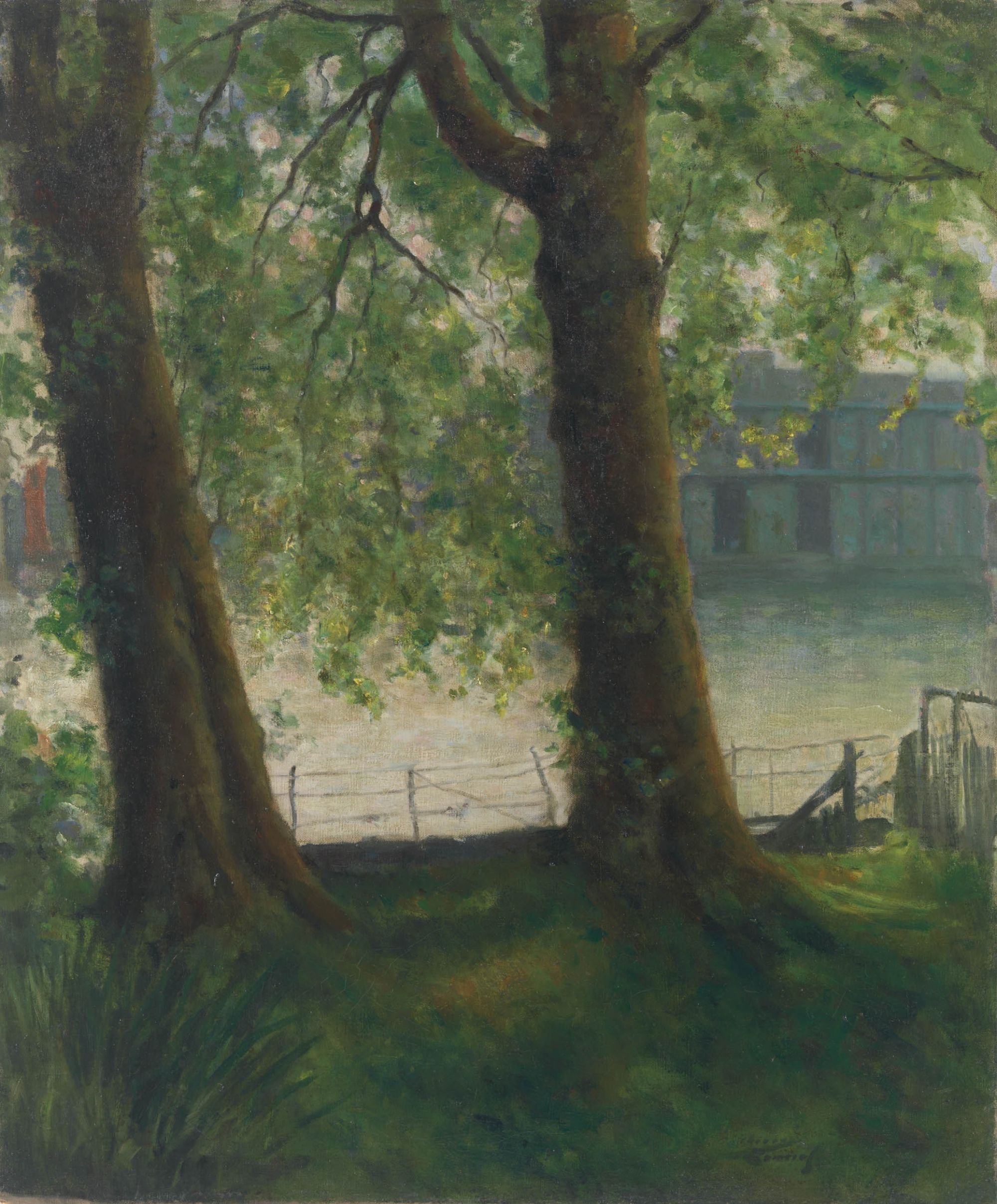 Another work featuring the Thames is a work Roussel completed later in his career was a work entitled The Thames at Hurlingham. This atmospheric work has all the characteristics of a Whistler painting. When Roussel made preliminary sketches for this work he was probably in the grounds of the famous Hurlingham Club, one of Britain’s greatest private members’ club which borders the Thames at Fulham. In the painting we are treated to the merest glimpse of the river and the house on the opposite bank as we peer between the two mature lime trees whose size has cast the bank in deep shadow.