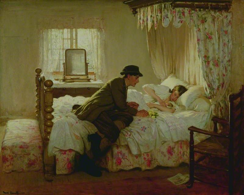 In 1880 Clausen exhibited his work La Pensée at the Grosvenor Gallery in London. It was a difficult depiction for an artist with the model seated in an interior. The figure is not seated parallel to the plane of the picture and the rear wall. It is a work of art full of detail. Look at the right background and you can see the edge of an elaborate chimney piece. In the left background there is a drop leaf table and on the floor a goat skin rug. The lady sits upright in the chair looking out at us whilst grasping a knot of violets in her right hand which rests in her lap. This is the key to the title of the painting (Thought). Here is a lady lost in thought about her lost love.