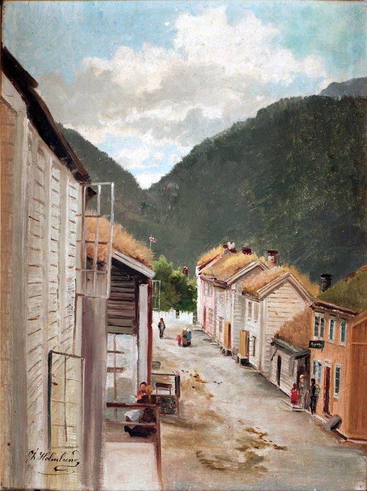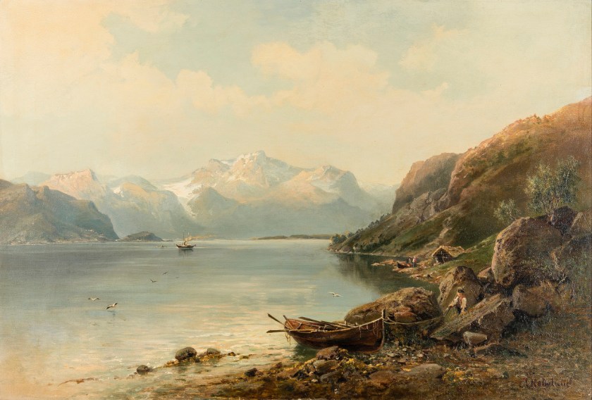 Another painting of hers which I like is one featuring the tranquillity of the fjord which has lost its “V” shape as it is further from its source and closer to the sea. In this work we see a steamer, puffing out smoke from its tall funnel as it chugs across the wide expanse of water. In the right foreground we see a man making his way down to his row-boat. On the bank of the fjord on the right mid-ground of the painting we can just make out a man and woman standing next to their boat and boathouse.
