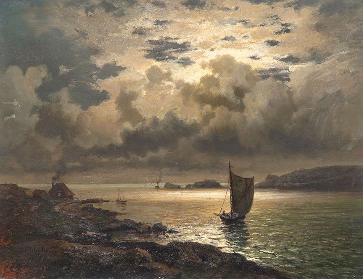 Josefina painted a beautiful and evocative sunset scene in 1879 entitled Kustbild med båt, (Coastal scene with boat). Dark storm clouds almost obliterate the setting sun the rays of which force their way through to create a golden halo on the surface of the fjord. Despite the prospect of an on-coming storm, a small sailing ship in the foreground sets out on its perilous journey. In the left mid-ground we see a small cottage perched on the rocky bank of the fjord. Look at the myriad of colours, such as silver, greys and gold, she has used in depicting the water.