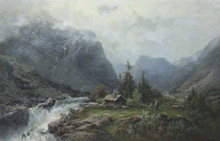 In 1863, aged thirty-six, she travelled to Dusseldorf and went to live with her sister Jeanette. Jeanette Holmlund who was also a painter had married the Norwegian landscape painter Nils Björnsson Möller. Whilst living with them Josefina became influenced by her brother-in-law’s art. She continued with her artistic studies and became strongly influenced by the “Dusseldorf School of painting”, which referred to a group of painters who either taught or studied at the Düsseldorf Academy of Art in the 1830s and 1840s, when the Academy was directed by the German Romantic painter Wilhelm von Schadow. The work of the Düsseldorf School is typified by finely meticulous yet imaginary landscapes. Such landscapes often had religious or allegorical stories set in the landscapes. Members of the Düsseldorf School were great believers in plein air painting, and tended to use a palette with relatively subdued and even colours. that was a national romantic emphasis that depicted dramatic nature scenes, waterfalls and rapids with rocks.