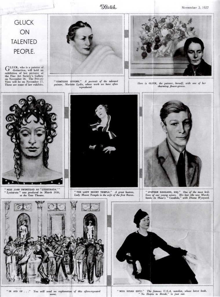 For Gluck her artistic life had to continue notwithstanding her often troubled relationship with Nesta and on November 16th 1937 her new solo exhibition at the New Bond Street premises of The Fine Art Gallery opened. Thirty-three of Gluck’s paintings were on show with others on stand-by. There was a mix of genre – portraiture featuring people who were in the news at the time, floral paintings and idealised landscapes. All were up for sale and the prices ranged from £2 to £300. As was the case with her 1932 exhibition, this one was hailed as a great success. In the November 24th 1937 edition of the Bystander, a British weekly tabloid magazine, the art critic wrote: