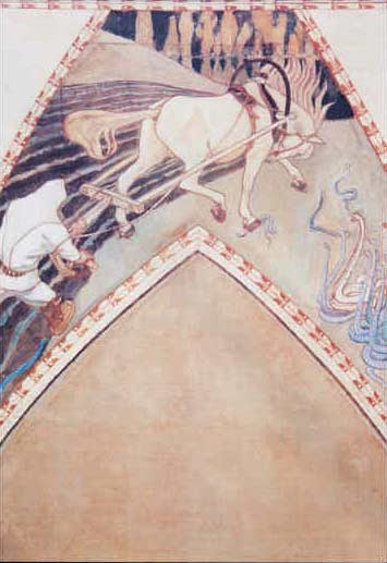 In 1900 Axel Gallén was commissioned to paint frescoes for the Finnish Pavilion at the Paris World Fair. One of the frescoes was Ilmarinen Ploughing the Field of Vipers. Ilmarinen, the Eternal Hammerer, blacksmith and inventor was a character in the epic poem, Kalevala, and is a god and archetypal artificer from Finnish mythology. Axel, a staunch follower of Finnish nationalism, took the opportunity to make the depiction very political as he painted one of the vipers in the fresco as wearing the Romanov crown, and the process of removing the vipers from the field was a clear reference to his wish for an independent Finland.