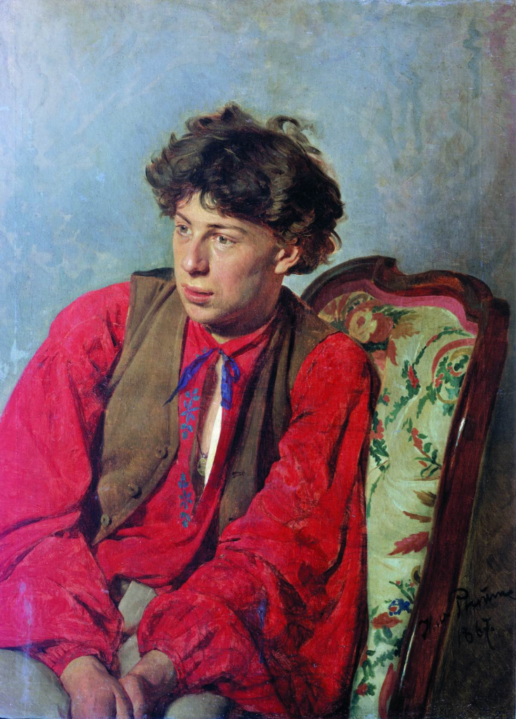 Surprisingly, the St Petersburg Academy initially welcomed the Peredvizhniki and even allowed them to host their first exhibition 0n November 29th, 1871. In all there were forty-seven paintings exhibited which received favourable reviews from the art critics. Ten of the paintings were portraits establishing the role of portraiture within the group. Kramskoi put forward three portraits of fellow artists, one of which was a monochromatic one depicting Fedor Vasilev. Vasilev was a Russian landscape painter who brought to the Russian art scene the term “lyrical landscape”. Lyrical landscapes were those which exhibit a certain spiritual or emotional quality. It could be that the depiction is of a sensitive and expressive nature. It could also be that the landscape, as well as depicting a picturesque view, conveys a particularly reflective, ardent or tender feeling, conceivably associated with romanticism. Vasilev was one of the twenty founder members of the Peredvizhniki Association in 1870. In 1871, aged just twenty-one, he was diagnosed with tuberculosis and so left St. Petersburg and travelled to Crimea, where he had hoped to find a cure for his illness. The plight of Fedor Vasilev touched the heart of many of his friends and contemporary artists. Kramskoy regularly contacted his friends asking them to help the ailing artist. The Society for Promotion of Artists sponsored his stay in the Crimea, but to meet his living costs he had to sell his paintings. He died in Yalta on October 6th, 1873 at the age of 23. A posthumous exhibition was held in Saint Petersburg and was an outstanding success with all his paintings being sold prior to the start of exhibition. Kramskoy’s portrait of Vassily avoided a mawkish depiction of a dying young man. Instead he depicts the young artist as a dapper young professional with an aura of dignity and professionalism wearing his attractively tailored three-piece suit and fob watch. Feodor Vassily reputation as a “boy genius” was well founded.