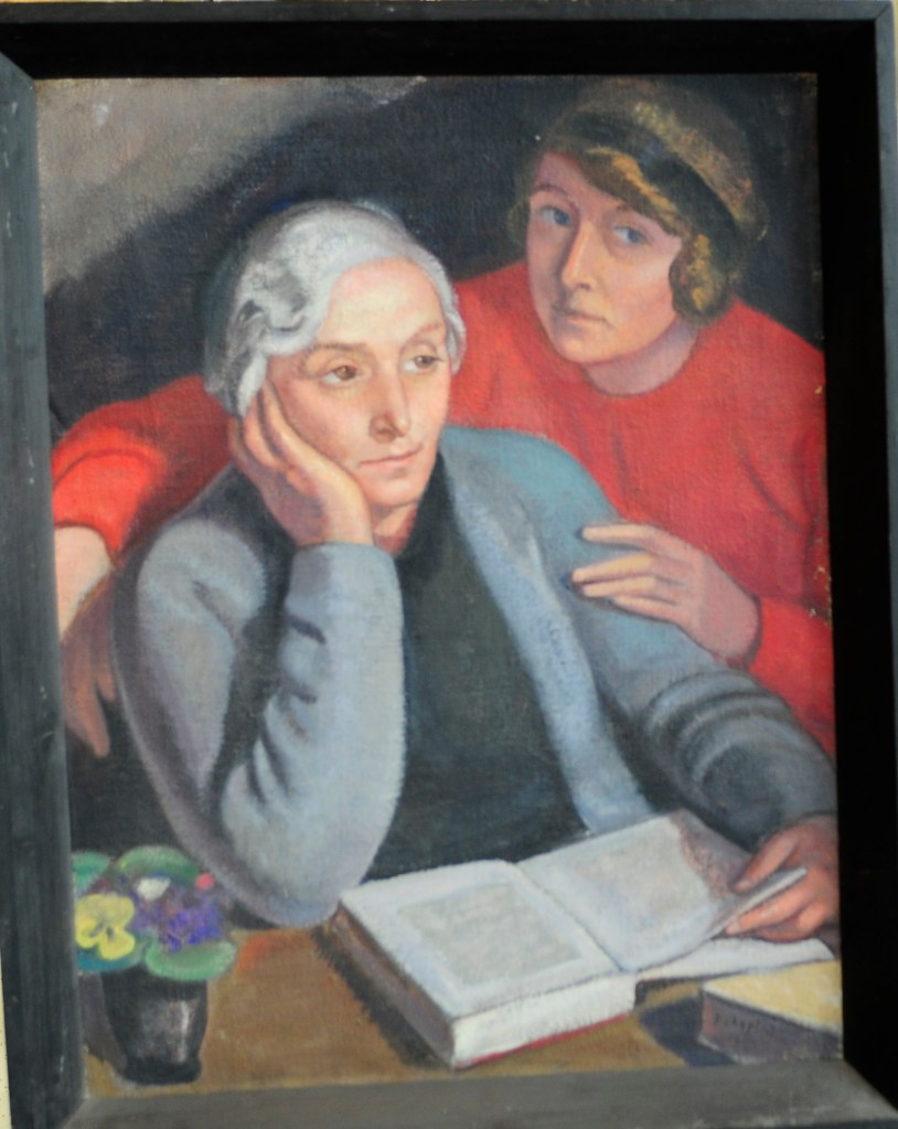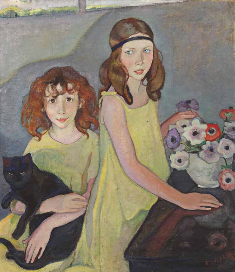 I think my favourite Elisabeth Chaplin work is one she painted in 1921 when she was living in Paris. Its title is Les Jeunes filles en jaune (Young girls in yellow). The painting depicts them dressed in yellow-coloured clothes and this derives from the many self-portraits Elisabeth did during her childhood. The two young girls are totally different. The redheaded girl on the left is seated. Her hair is unfettered. She stares out at us with such intensity. Cradled in her arms is a black cat, a creature that is often looked upon as being enigmatic and yet sometimes malign. The cat is a sacred icon that infuses mystery and thus this young girl represents disorder and turmoil. The other girl with her distant blue eyes is so different. There is an air of calm and graceful tranquillity about her. Her hair is neatly coiffed and she is seen touching a bunch of anemones, the embodiment of innocence. This duality is a connotation of Symbolism and we again see the duality with the reflection of the girl’s hand and the vase on the dark brown table.