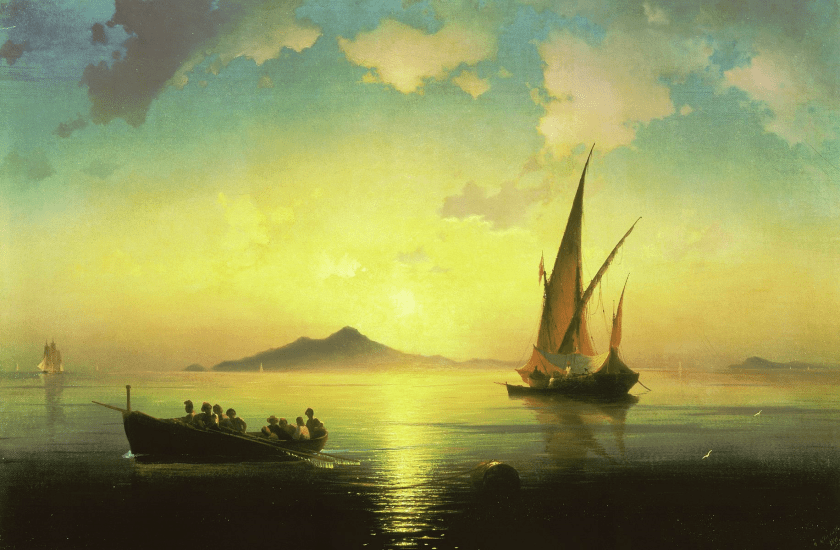 In 1842 Aivazovsky had completed his two-year stint in Italy. He had spent many hours in various museums studying paintings by the Italian masters and became heavily influenced by Italian art and he looked upon his time at the museums as time in his “second academy”. He was awarded a gold medal by Pope Gregory XVI for his artwork. Aivazovsky left Italy in 1842 and travelled around Europe for the next two years. He had his work exhibited in an international exhibition at the Louvre, where he was the only representative from Russia. During his stay in France, he also received a gold medal from the Académie royale de peinture et de sculpture. In 1844 he returned to Russia.