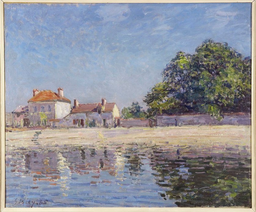 In July 1874, Sisley made a return trip to London with his friend the famous French Opéra-Comique singer, Jean-Baptiste Faure, an avid collector of Impressionist paintings. Faure bankrolled their trip by buying six of Sisley’s works. The pair stayed initially in South Kensington before moving to Hampton Court. Hampton Court was a popular leisure resort with good accessibility to central London. In that year Sisley completed a painting depicting part of the bridge joining Hampton Court with the small village of East Molesey on the south side of the river Thames. It was entitled Une Auberge à Hampton Court (Hampton Court Bridge: The Castle Inn). The Castle Inn, which some believe could have been where the pair were staying, is the focal point of the painting. The relaxed leisurely feeling is depicted by the elegantly clothed figure as he saunters down the road towards us. Sisley has overpainted the light grey ground with bright tones. Look how Sisley has emphasised the broad gravel street by placing his figures to the very edge of it and by doing this he has established a broad vacant zone directly in front of us.