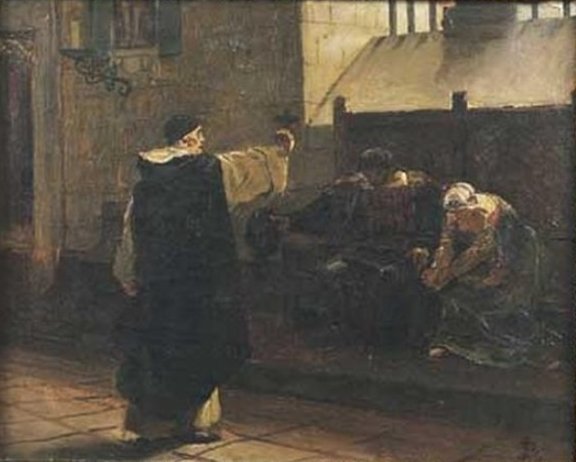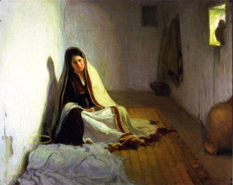 La Sainte Marie is a very strange depiction of the Virgin Mary with the Christ child. Mary appears melancholy and lost in thought. The infant, who is lying on the floor, is almost completely covered by a shroud-like cloth, possibly suggesting a foreshadowing of his death. Tanner was painstaking when it came to detail and took back home with him sketches which he had made whilst in Jerusalem, where he first travelled in 1898. Tanner’s style is academic and is distinctive for his use of luminous lighting. The model for the depiction of Mary was again Tanner’s newlywed Swedish-American wife.