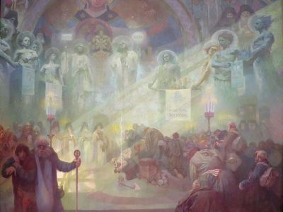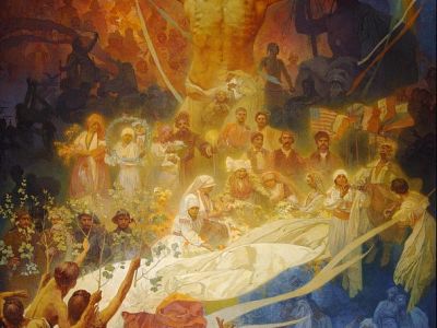 Bok first went to London and met the American muralist, illustrator, and painter Edwin A. Abbey, who had based himself in London since 1883. Abbey was working on a project for the capitol building in Harrisburg, but Bok persuaded him to agree to the commission and was given free rein to paint anything he liked for the proposed Curtis Centre mural. Bok returned to America elated with the deal he had made with Abbey. However, the day after Abbey started work on the mural, he collapsed and died. Bok still preferring not to approach Parrish, tried to contact Howard Pyle who was making a name for himself as an educator and muralist. Pyle had been living in Italy with his family for a year. Bok had never met Pyle and on finally contacting Pyle’s home by telephone he was informed that fifty-eight-year-old Pyle had just died in Florence of a kidney infection. Still undeterred and disregarding fate, Bok approached a third artist, Louis Boutet de Monvel, a famous decorative master, and he agreed to carry out the project, Monvel was invited to Philadelphia to inspect the space at the Curtis building and discuss the project but almost immediately after arrangements were made, Monvel died in Paris.
