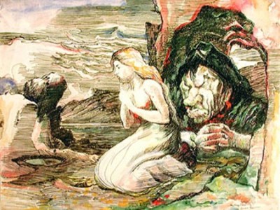One such work was In the Whiting Ground which he completed around 1900 and depicts a small dinghy at sea with a young man standing holding a fishing line in his hands while an older man is holding a line in the water. St Michael’s Mount the tidal island in Mount’s Bay, a large, sweeping bay on the English Channel coast of Cornwall, can be seen in the far distance.