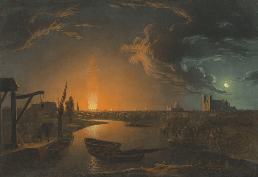 It was not just fire lighting up the sky by natural phenomena, that Abraham captured in some of his works of art but also devastating events of buildings burning such as his painting entitled The Fire at the Old Drury Lane Theatre seen from Pimlico. In this 1809 painting we witness the destruction of Richard Brinsley Sheridan’s Drury Lane Theatre in 1809, which Sheridan had completely rebuilt in 1794 with the architect Henry Holland. It is said that when Sheridan, who was in the Houses of Parliament at the time when the fire broke out, heard the news, he hurried to his theatre. Upon realising that there was little he could do to help, he sat down in the coffeehouse opposite and ordered a bottle of port, remarking rather dryly ‘a man may surely be allowed to take a glass of wine by his own fireside’. It is a work of Romanticism which was popular around the beginning of the nineteenth century. Abraham has cleverly balanced the light sources emanating from the moon and the fire, which adds a sense of excitement to the depiction. Another interesting fact about this depiction is that it actually shows a lost view of London as the river seen is not the Thames, but part of the River Tyburn, which now flows beneath the city, coming out into the Thames at Whitehall Stairs, near Downing Street.