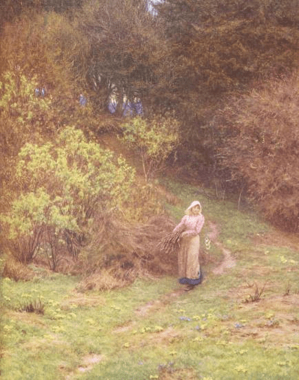 In November 1875 Helen gave birth to her first child, a son, Gerald Carlyle named after her and her husband’s good friend. In February 1877 a second child, a daughter, Eva Margaret, was born. Her third child, a son, Henry William was born in 1882. He was the love of Helen’s life and she would often wear a locket with just his picture inside. In 1874 Helen Allingham had two of her watercolours, The Milkmaid and Wait for Me, exhibited at the Royal Academy and in 1875 she was put forward by the eminent watercolourist, Alfred Hunt, to become an Associate in the Royal Watercolour Society. She was later to become the first woman to be admitted to full membership.