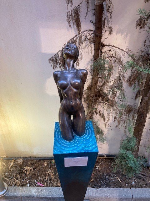 At the rear of the gallery there is a narrow outdoor passage way which was lined by statuettes by Anneke Bester. Anneke Bester is a South African born artist who now considers New Zealand her home country. She not only exhibits in New Zealand but also regularly in Portugal and Dubai. Her body of work is a combination of one-off, delicately cast, bronze sculptures as well as editioned works. Anneke’s work focuses on celebrating Femininity in all its aspects. She sculpts gorgeous female forms in sensual poses. She develops the female energy of nature and depicts the female forms as daughters of mother earth in her most recent work.poses. She sees the female in its internal beauty and its core driving force that only a female sculptor can explore to its full extent.