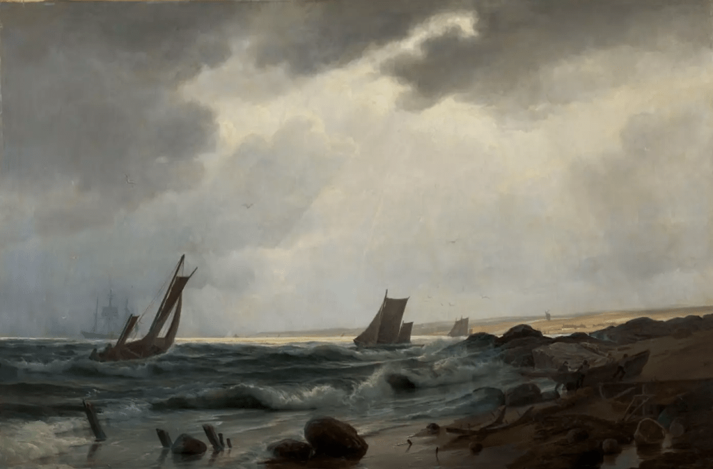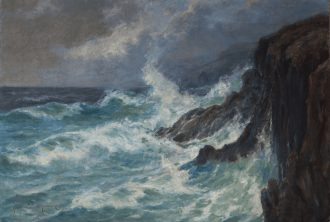 The beauty and ferocity of the sea is captured in Drachmann’s painting entitled Rocky Coast. It depicts the unstoppable waves of the blue-green sea crashing violently against a towering rock formation in the foreground of the painting. To the left, we see heavy grey storm clouds. It is a depiction which is devoid of figures and one’s focus is simply concentrating on the violent force of nature. There is nothing noted as to the location of the scene but during his lifetime he visited many places, such as the Orkney Isles, and Norway, with their rocky coasts and archipelagos or it could have been locations in Newfoundland or Nova Scotia, places he visited during his long trip to North America.