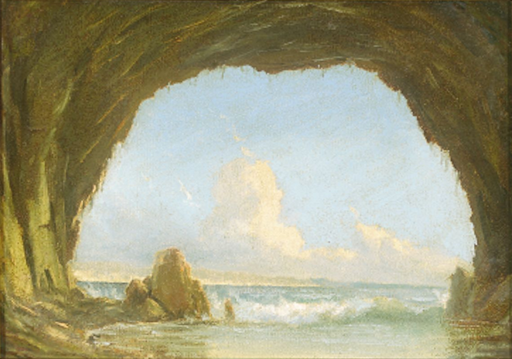 To further his interest in marine painting, Holger went to stay on the island of Bornholm. This Danish island is located in the Baltic Sea, to the east of mainland Denmark, and south of Sweden. It was here he painted a number of seascapes. One of his Bornholm paintings depicted Vade Ovn, a notable rock or group of rocks attached to the underlying bedrock. It is a grotto, part of the area known as Helligdomsklipperne.