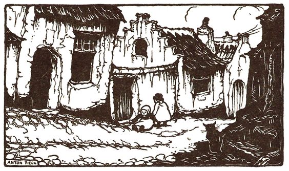 In 1921 Pieck illustrated Felix Timmermans’ book Pallieter by the Flemish author Felix Timmermans. As the book was set in Flanders Pieck decided to visit there to soak up the atmosphere in the various towns. Above is an ink illustration from one of the chapters, A beautiful winter day in which the main character, Pallieter, goes out on a clear winter day and hears organ music. He heads towards the sound, but only sees two children playing with mud.