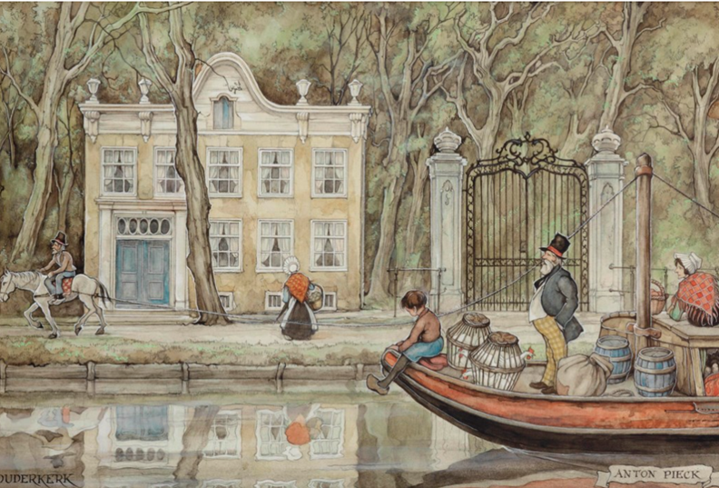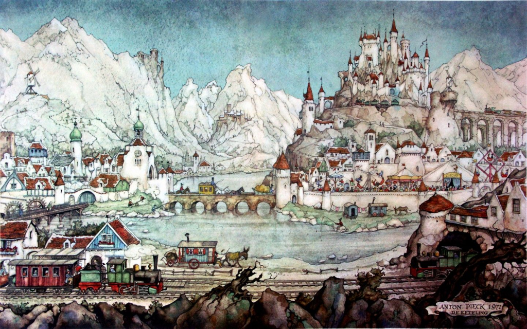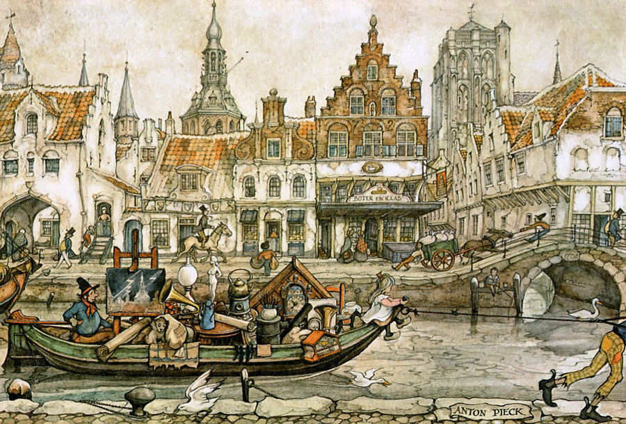 Anton Pieck loved nature, the past and Dutch cityscapes. Sadly, during the course of the 20th century, large swathes of that old Netherlands he loved disappeared due to bombing during the war, the renovation and rejuvenation of the city centers from the 1960’s and the construction of the complicated road network. As a result, Anton became sad and depressed at what he witnessed during his latter years, saying in 1985: