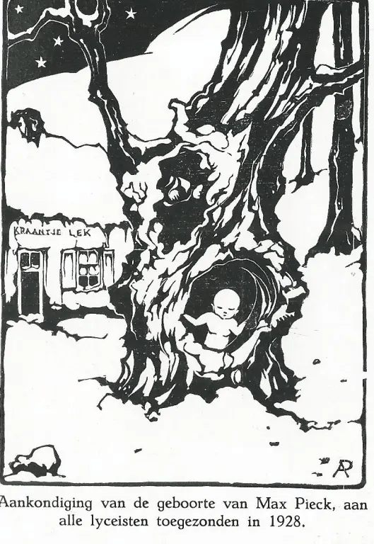 Anton Pieck’s way of announcing the birth of son Max Pieck sent to all the staff of the Kennemer Lyceum in 1928