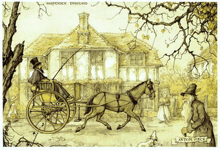 He had fallen in love with the Dickensian era and had completed many paintings, drawings, etchings and engravings depicting Dickensian scenes. He depicted gentlemen in high hats or ladies adorned in crinoline, people taking coach rides, watching a magic lantern show or listening to barrel organs or chamber concerts. All such scenes gave him great pleasure and they all contributed to his artistic ideal. Anton Pieck was adamant that when it came to commissions, he would only accept those which allowed him to illustrate novels or short stories set in bygone days.