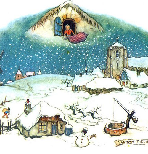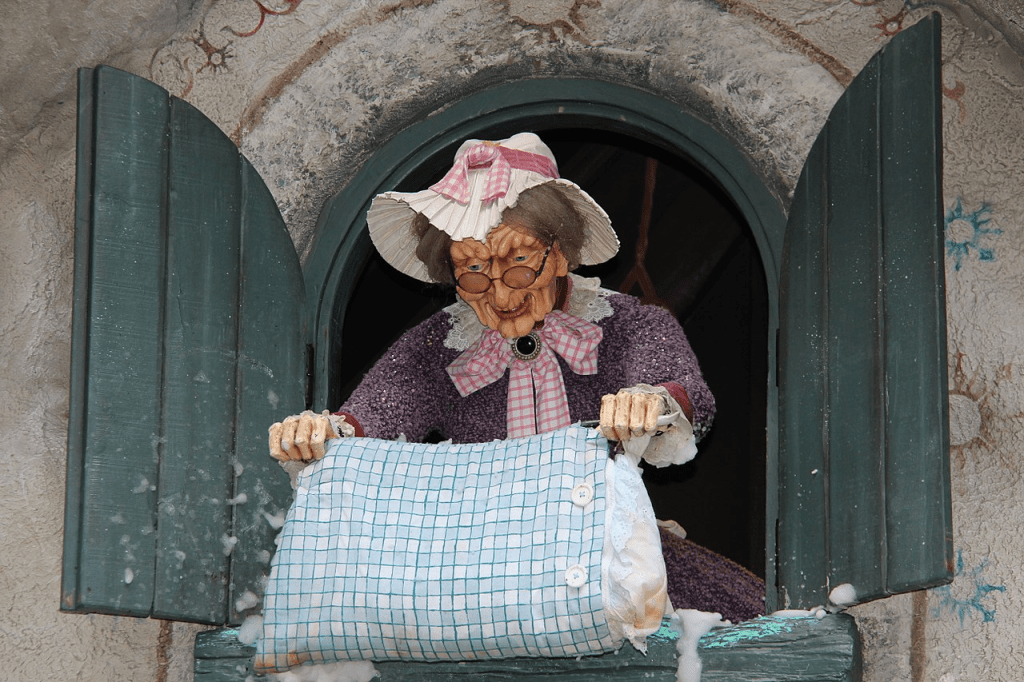 Frau Holle is often depicted shaking out bed linen over an outside balcony then it begins to snow. It is still a common expression in Hesse and Southern parts of the Netherlands and beyond to say “Hulda is making her bed” when it begins to snow. Like many other tales collected by the Brothers Grimm, the story of Frau Holle was also a moral tale explaining that hard work is rewarded and laziness is punished.