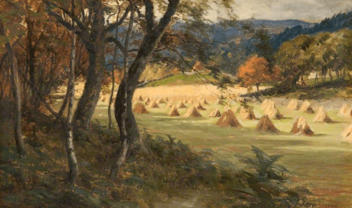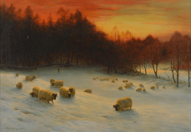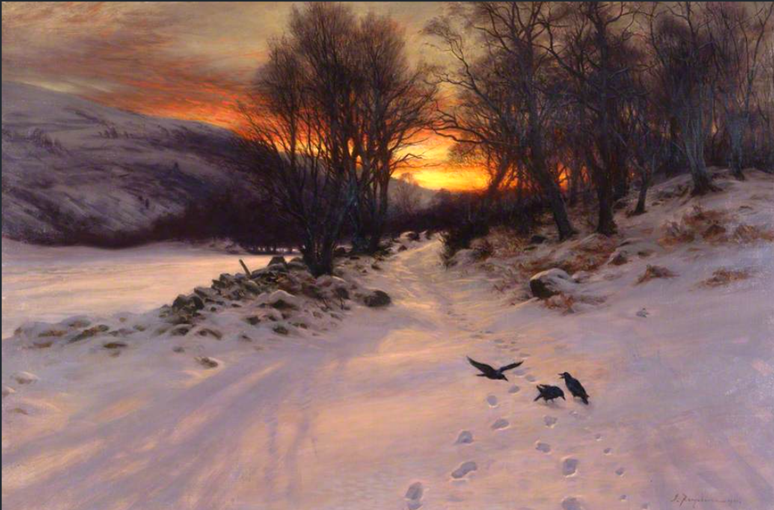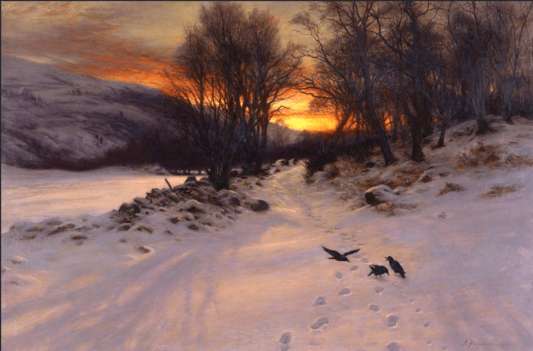 No compilation of winter landscape paintings would be complete without the inclusion of such works by Pieter Bruegel the Elder. In 1565 he completed his oil on wood painting entitled The Hunters in the Snow which is also referred to as The Return of the Hunters. The work is part of the Kunsthistorisches Museum in Vienna, Austria. It is one of his great genre painting scene with an aeriel viewpoint of a winter’s scene. The painting was one of a twelve-work series depicting different times of the year and this one is set in the depths of winter during the months of December/January. Before us we observe a wintry scene and in the left foreground, we see three hunters who are returning from an outing along with their dogs. They are heading down a snow-covered slope towards a small village. Looking at the men trudging resignedly home with their dogs it appears not to have been a successful hunt with only one of the men carrying over his shoulder one dead fox, the fruit of their labour. As if to taunt them, there are footprints of rabbits around them, which they failed to ensnare. It is a cold overcast winters day with little or no wind as we can see by the lack of movement of the wood smoke. Bruegel has used muted white and grey colours in this composition to give it an air of melancholy. On the leafless trees we see crows perched on the bare branches. The setting is a flat-bottomed valley through which a river meanders.