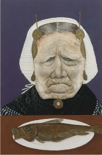In the background we see an idealised landscape depicting jagged mountain summits which do not exist in Bruegel’s homeland but which would have been seen with him during his time in the Alps. At the bottom right of the painting we see the large wheel of a watermill which has been frozen stiff. Below on the frozen lake people are ice skating. To the returning hunter’s left we can see an inn with villagers preparing a roaring fire in preparation of roasting a pig. The sign on inn is hanging askew. The image on the sign depicts a stag named Saint Hubertus, who is the patron saint of hunters. The words are in Dutch, Dit is Guden Hert, which means in English “This is the Golden Deer”.