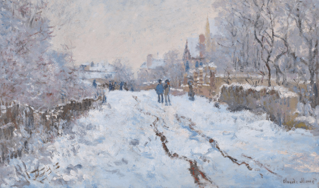It is believed that due to a series of severe winters in France in the 1870s it contributed to a sudden increase in the number of winter landscapes produced by Impressionists. My next painting I am showcasing is one created by Alfred Sisley in 1874, entitled Snow at Louveciennes. Before us we see a picturesque scene of stillness set in early winter’s morning in Louveciennes, a small village in the Île-de-France region in north-central France, located in the western suburbs of Paris, between Versailles and Saint-Germain-en-Laye. Sisley depicts the sky in white, crisp blue, and grey hues. His use of perspective guides the viewer along a winding road which vanishes into the background. The buildings in the paintings are covered with snow and we see a lone woman holding an umbrella strolling along the pathway, which has trees on either side. The artist is willing us to take a walk with the woman as she heads towards the village. Sisley was entranced by views of the countryside during the winter months. In fact, unlike most of us who dreaded heavy snowfall Sisley was inspired by what he saw and was especially attracted by how the variations in light came into play in snow scenes.
