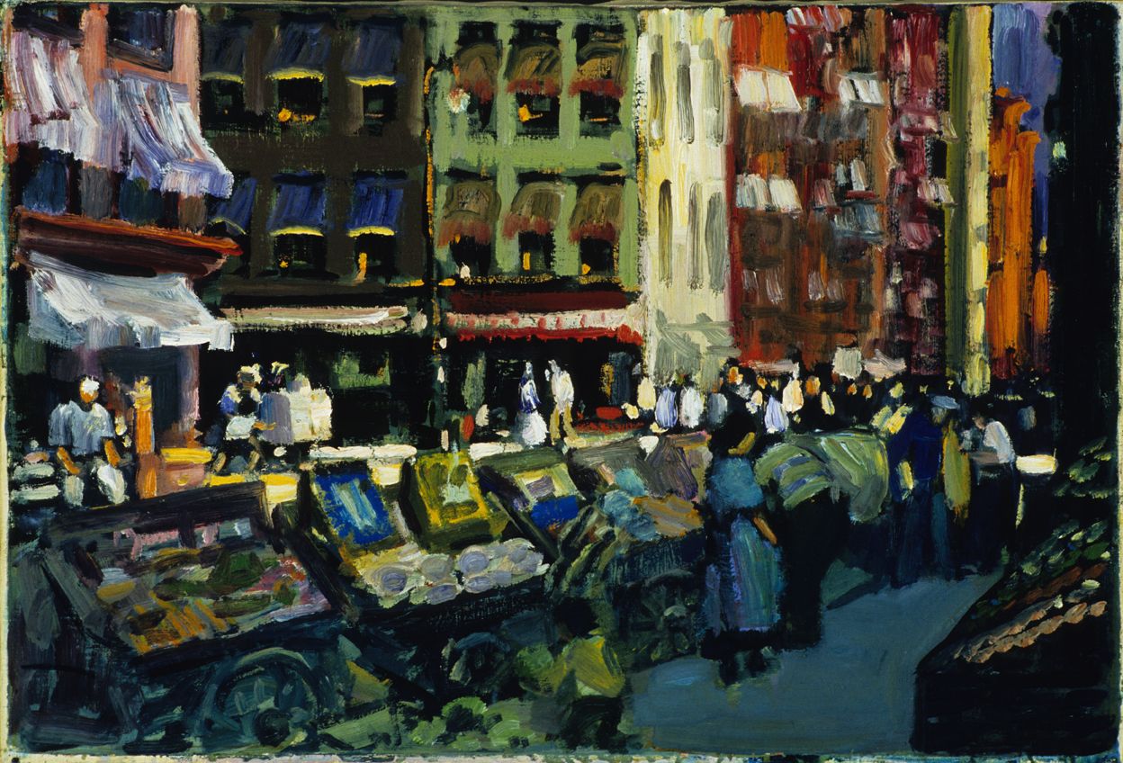 One of his most famous paintings was his 1905 work entitled Street Scene (Hester Street). The setting is a push-cart market on Hester Street on the Lower East Side of Manhattan, an area of the city which was packed with recent Jewish immigrants. From our viewpoint looking down the street we see a crowd of shoppers, both men and women and in the foreground we see children, milling around a toy pedlar, searching for bargains. Many art historians have judged the depiction to be a compassionate pictorial essay of Jewish life. We see the people in profile, and Luks has paid particular attention to skin colour and the physical features of the people in the crowd, while the subject matter relates to a series of caricatures of Jewish peddlers. It is a congested depiction and we only get small glimpse of the blue sky in the middle background. In the middle-ground we see the darkly oppressive inexpensive tenement blocks, in which were apartments that were so designed to house hundreds of these people, maximising the profits of the landlords.