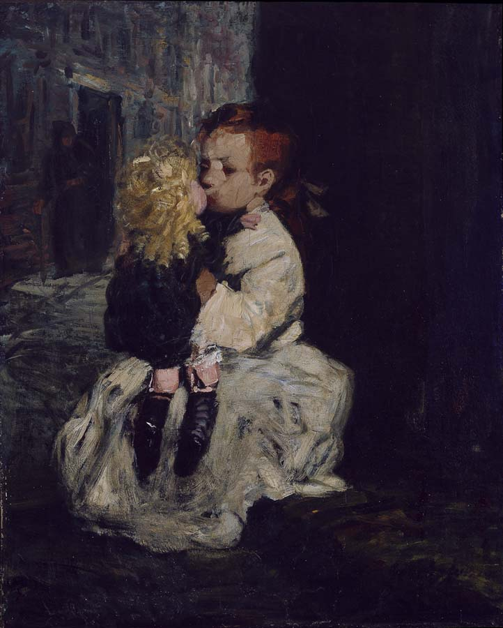 “…The east side is yet to boast its Dickens. And Dickens would have enjoyed the picture of the little tousled Irish girl with her red locks who dances with the pretty flaxen-haired German child, surely a baker’s daughter of Avenue B. Now you might suppose that this vivid art, this painting which has caught and retained the primal jolt and rhythm of the sketch, might be necessary rude and unscientific in technique. It is the reverse. This particular picture is full of delicious tonalities. The head of the blonde girl might be from an English eighteenth century masterpiece…”