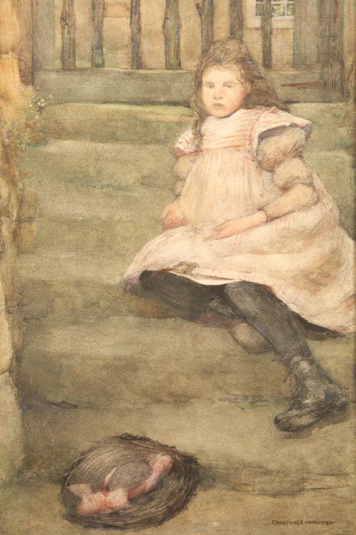 Day Dreams by Constance Walton is a large watercolour depicting a young girl sitting on steps looking distractedly into the distance. Constance Walton’s figurative paintings are quite rare as after her marriage in 1886 she concentrated on her flower and botanical paintings. This depiction could have been influenced by her brother, Edward’s work of the same name which he completed in 1885.