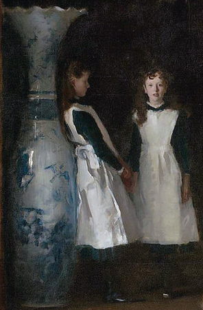 The painting by Sargent is not a conventional group portrait as Sargent has positioned the four girls individually. There is no connection between the siblings. The two older sisters are placed in the semi-shade in the background while the youngest is centre stage in the foreground holding her doll and the other girl is standing alone off to the left. Each of the girls is presented individually, but the features of the two older girls are obscured, by the darkness of the background. The presence of empty space, and the isolation of the figures all add to the sense of quiet anxiousness. Florence with her back to the vase comes over as being independent and refuses to participate at all and Jane, facing us, is left unsure whether to side with her big sister or to emerge from the shadows and face the artist.