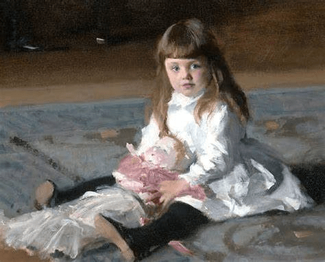 In the painting, the light comes from the left. The two older daughters are shielded from it by the recessed enclave they stand in, a position which they have found for their uneasy refuge. All the girls wear white pinafores, which gives Sargent the opportunity to show off his absolute mastery of a full range of tones created by the folds and creases in the pinafores. It was a dark shadowy space in which Sargent then positioned the Boits’ four daughters. The youngest daughter, four-year-old Julia sits on the floor, eight-year-old Mary Louisa stands at the left midground of the painting whilst the two older daughters, Jane, aged twelve, and Florence, fourteen, stand in the background, partially obscured by shadow.