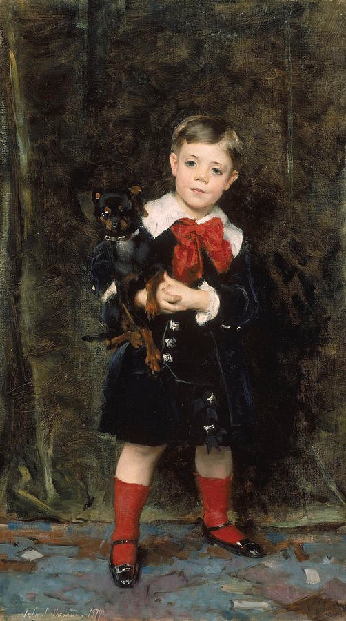 There is some doubt as to when Edward and Isa Boit met the artist, John Singer Sargent but it is thought most likely it was in Paris in the late 1870s during one of the many artistic soirees that the Boits and Sargent frequented. Another possible reason was the meeting came about through the auspices of Edward Boit’s teacher, François-Louis Français, whose close friend was Carolas-Duran, one of Singer Sargent’s tutor. Sargent was an expert portraitist and a third of them were commissions to paint children. An example of one such painting is Sargent’s 1879 Portrait of Robert de Cévrieux with his Pet Dog. We see him standing on an oriental rug in front of a curtained backdrop.