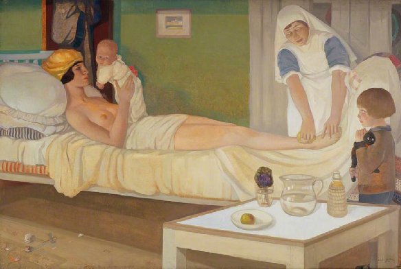 Cecile and Eric’s second child, another son, Edward, was born in December 1919 and it was shortly after his birth that Cecile started what was to be one of her most famous paintings, Romance. Cecile Walton depicts herself holding up her new-born son, Edward, for intense scrutiny, whilst her elder boy, Gavril, clutches his gollywog doll. Although nowadays the toy is recognised as a racist caricature, they were commonplace in British childhoods until the 1960s. The depiction of mother and baby is usually associated with the Madonna and Child but in Cecile’s painting, the depiction knowingly echoes a well-known impressionist image of a sex worker; Olympia as portrayed by Edouard Manet, and this implies a more troubled attitude to motherhood. The inclusion of carefully placed details such as petals on the floor, and the apple, add to the sense of unease. In the painting we see Cecile, depicted lying half naked in bed holding her new baby son. At the foot of the bed, we see her first-born child Gavril looking on. In an article in the Woman’s Art Journal, Frances Fowle, art historian and curator comments on the painting: