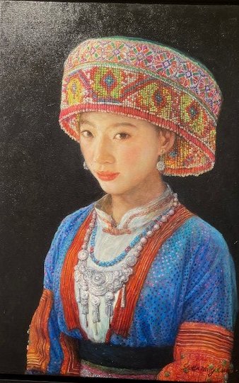 Each of the tribe has a quite unique tradition in dress and adornment from the other. The young girls sew everything entirely by hand and their jewellery is crafted in the village. Shen’s artwork the inimitable customs, dress and heritage of these minority tribes of Southern China. His painting demonstrate his empathy and admiration of these tribal people as they possess a lyrical beauty, dignity and grace.