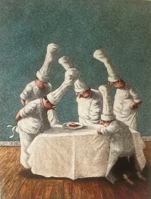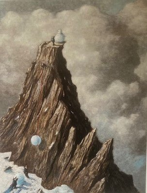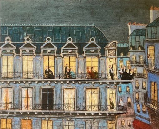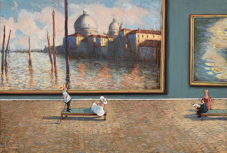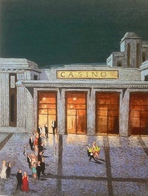 His depictions of the theatre reveal the humour and comical life behind the scenes and his large canvas’s show the insignificance of man. Prior to becoming a professional artist, he worked with in the theatre, creating and putting together stage sets for plays and opera.