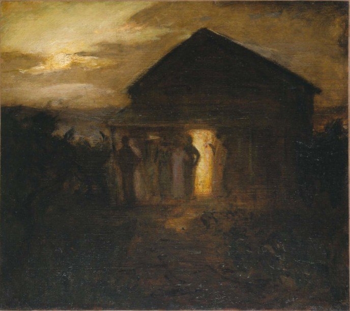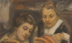This is also a depiction of Theresa’s beloved family. Theresa’s mother is the woman we see depicted at the upper left of the group, with greying hair, talking to Theresa’s mother-in-law, whose hands hide the delicate threads she is working with, head bowed as if in prayer. On either side of the mothers are two of Theresa Bernstein’s sisters-in-law, Bessie and Sophie, who was actually a milliner herself. One of them, dressed in black, has placed a newly made black hat on her head and is admiringly viewing the result in a hand-held mirror. Her sister, dressed in bright yellow, watches as her sibling vainly gazes lovingly at her reflection. She holds a black hat which has two large flame-like yellow feathers attached to it. In the lower right of the group, diametrically opposite her mother, is Minna, Theresa’s third sister-in-law, dressed in a white dress and they are testament to two generations of milliners. The final member of this working group of women sitting on the far right, dressed in green, is Katie. She is the only one to be looking out us. Maybe she is silently inviting us into this intimate circle. Katie was the family housekeeper and Theresa’s much-loved confidante.