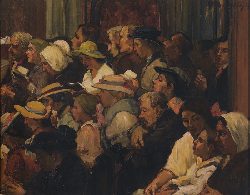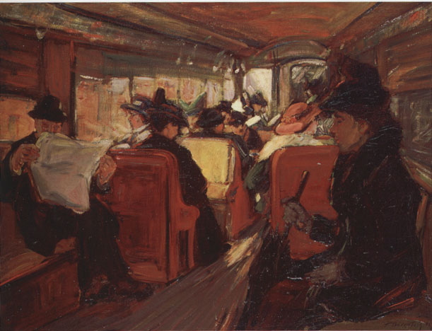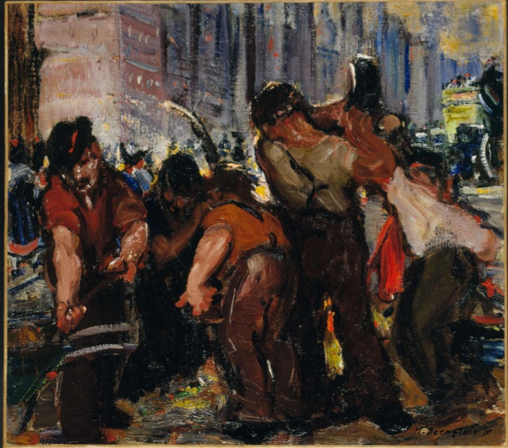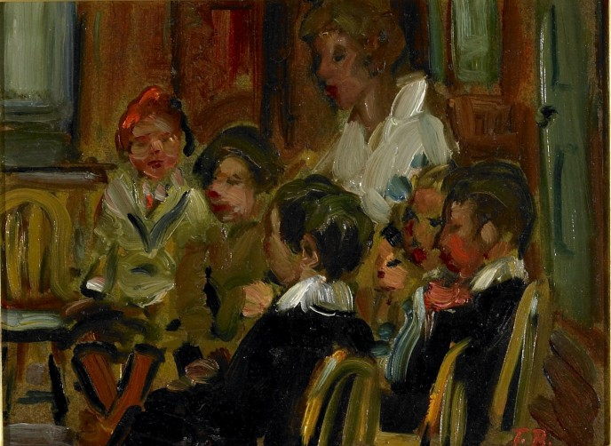 Bernstein’s 1921 painting entitled The Milliners is typical of many of her figurative works depicting a large group of people. Look back at some of her multi-figured paintings: the job-seekers in a crowded waiting room (Waiting Room – Employment Office), people crowded into a train on the elevated railway (In the Elevated), and many others depicting beach scenes at Coney Island or audiences at the music hall or theatre. Theresa was Jewish and although this 1918 painting, The Milliners, could not be termed Jewish, it was personal to Theresa as her sister-in-law worked in the millinery industry, a typical “vocation” that was both immigrant and Jewish.